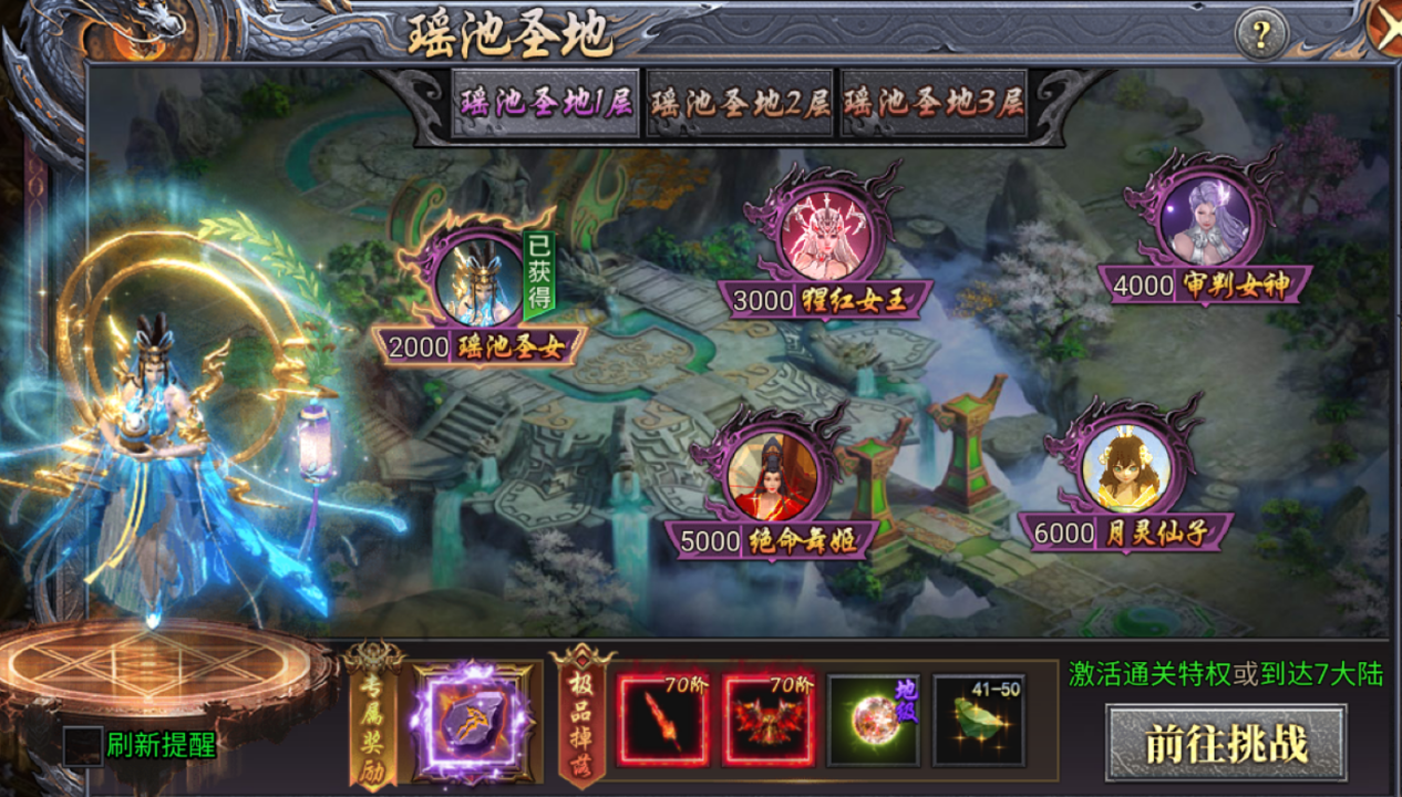 瑶池圣地共有3层,每层均有5个强大BOSS等你挑战!