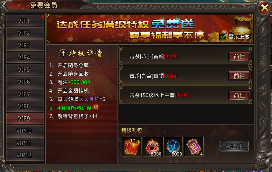 在本服中,VIP系统彻底打破了传统传奇“充值专属”的限制。通过挂机刷怪、参与福利玩法、完成系统任务,玩家即可持续获取VIP经验,逐步提升VIP等级。