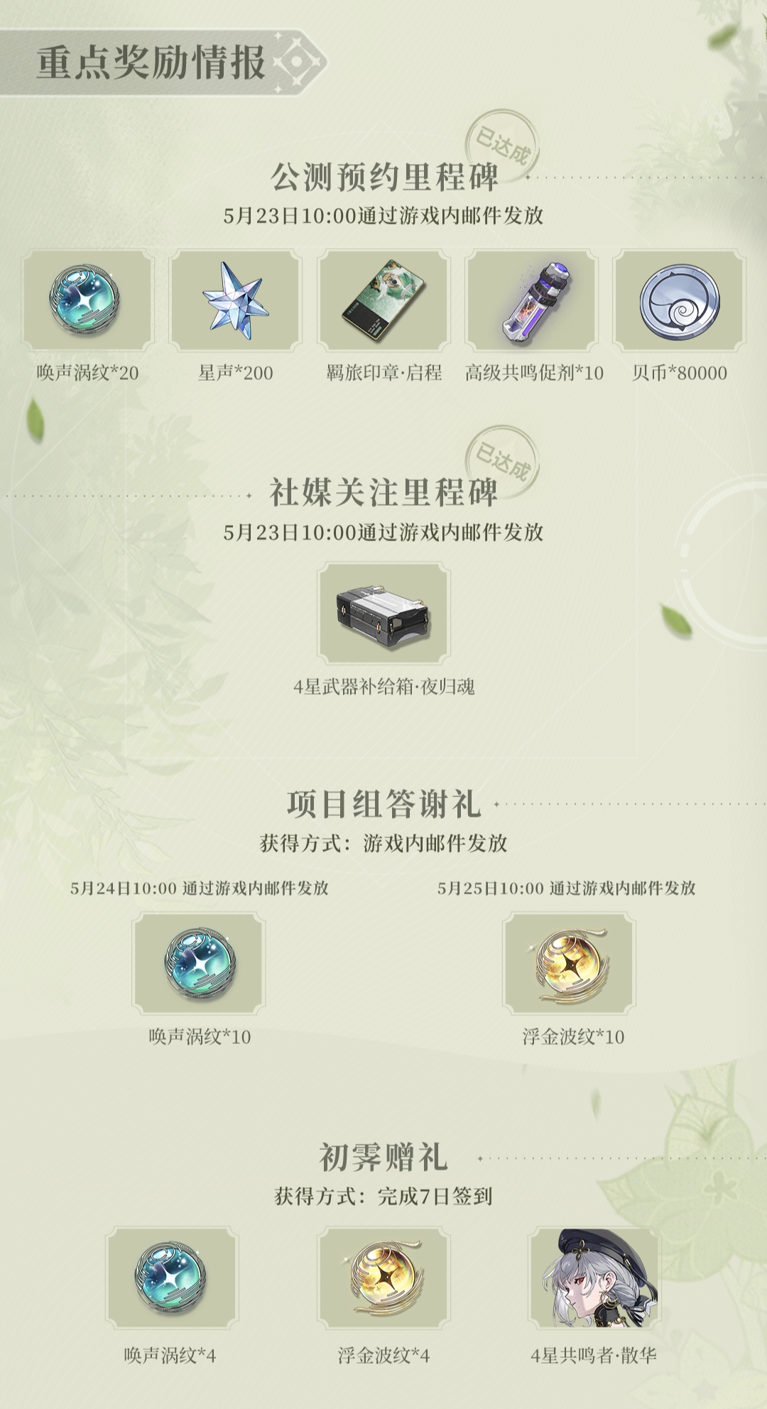3.等级奖励50抽+1600星声,自选五星武器宝箱,自选四星武器箱,二位四星角色,开服应该还有兑换码。