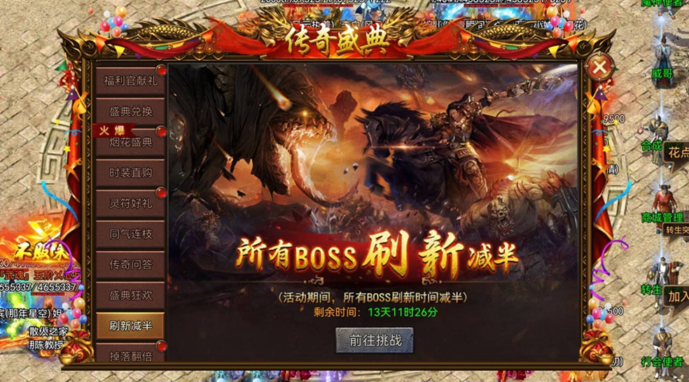 活动期间,所有BOSS刷新时间减半!疯狂挑战,高阶装备、稀有道具等你来爆!是时候展现真正的实力了~
