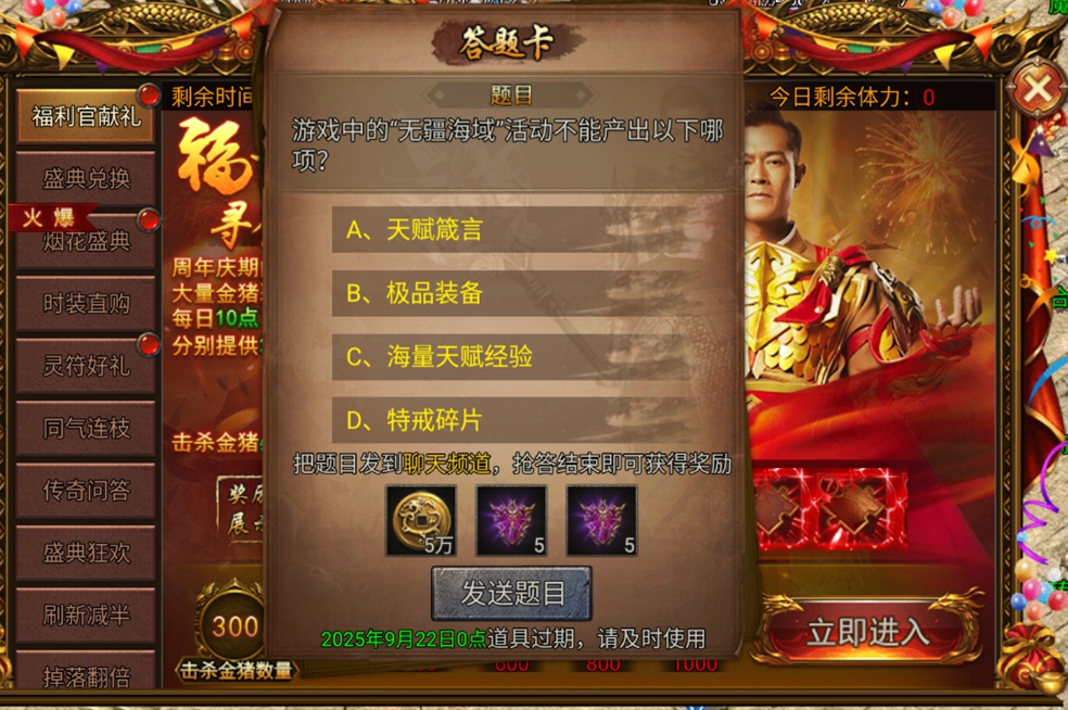 通过系列庆典活动获得「答题卡」,使用后相关题目将自动发布至跨服频道,参与抢答他人题目即可获奖。