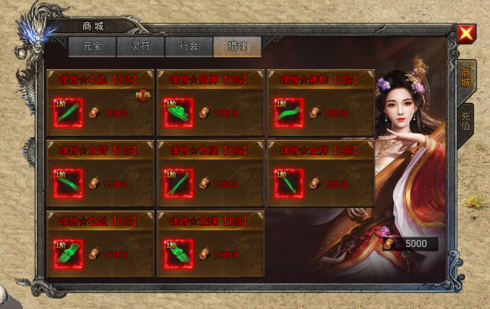 玩家可使用猎魂令在游戏商城中兑换8种1阶魂骨部件,具体包括:右肱骨、肩胛骨、腰椎骨、左臂骨、右腿骨、左腓骨、右趾骨、左踝骨。