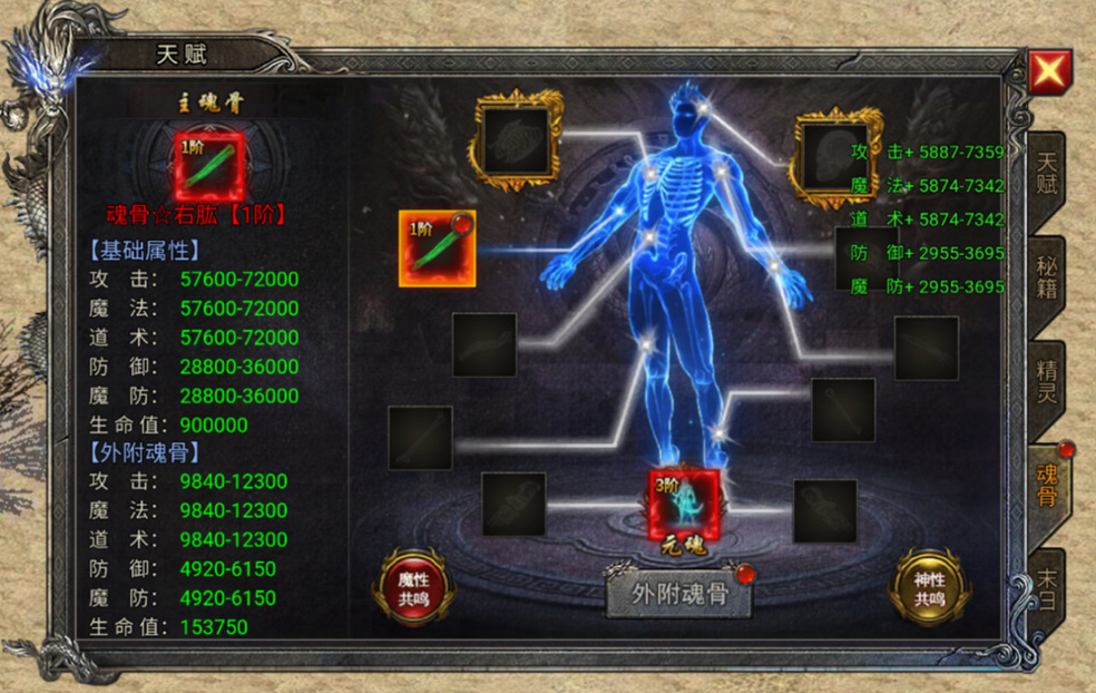 兑换得到的魂骨部件,需在【天赋系统-魂骨界面】进行穿戴。穿戴魂骨可全面提升角色的攻魔道、物理防御、魔法防御及生命值等基础属性。