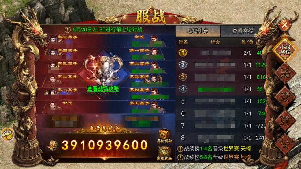 本跨服行会间进行对决,共7轮比赛。7轮结束后,根据最终排名发放丰厚奖励。