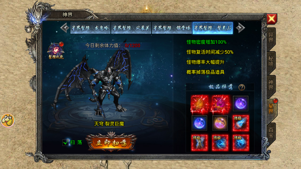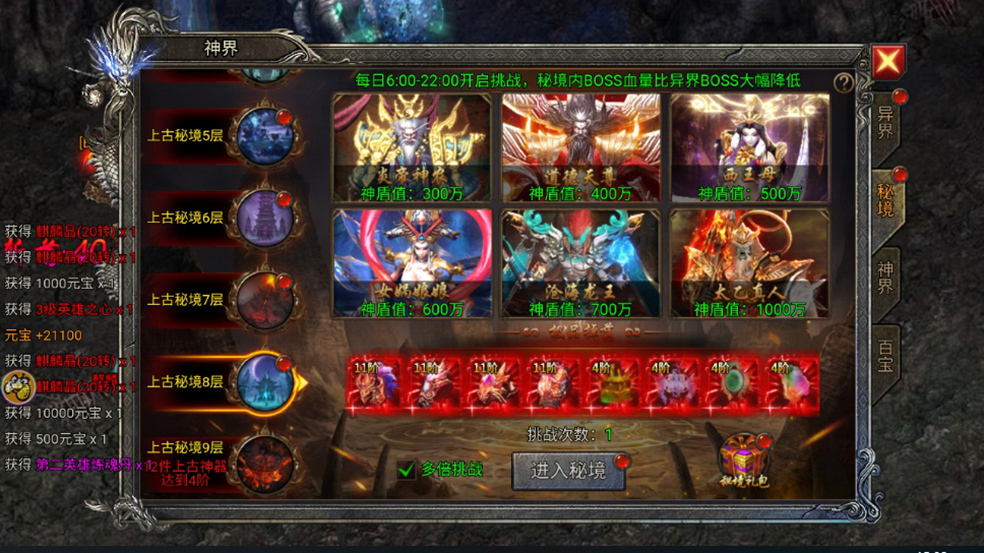 每次挑战异界BOSS需消耗20点神元,成功击杀可掉落神装与神器。而想要挑战更高层的异界BOSS,则必须穿戴足够数量的神器。