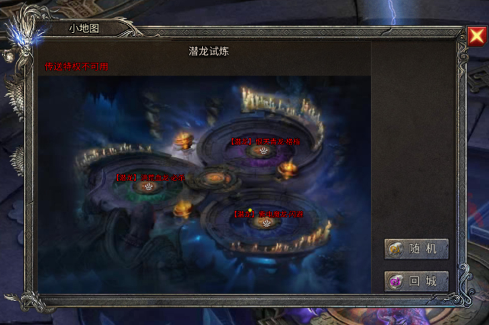 潜龙试炼无进入次数限制,地图中仅圣域属性生效,且无法使用传送特权。玩家的基础属性(攻击/魔法/道术/生命)将按比例保留,部分职业技能效果保留,等级统一视为混沌S级。
