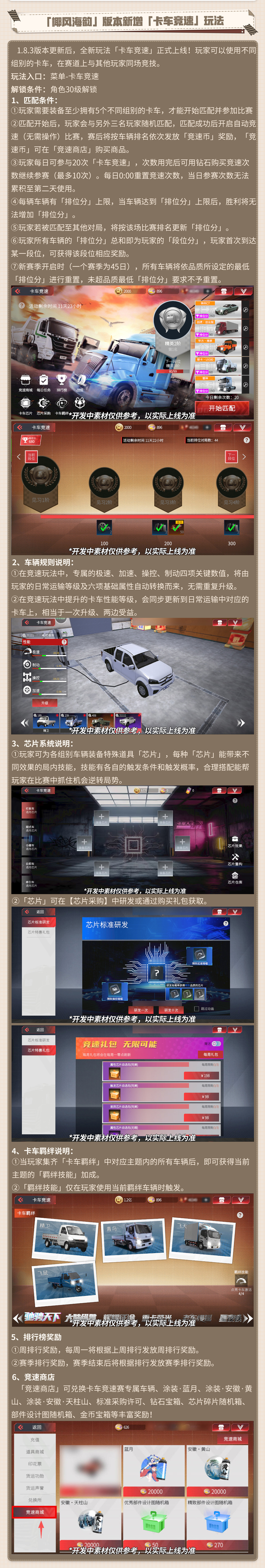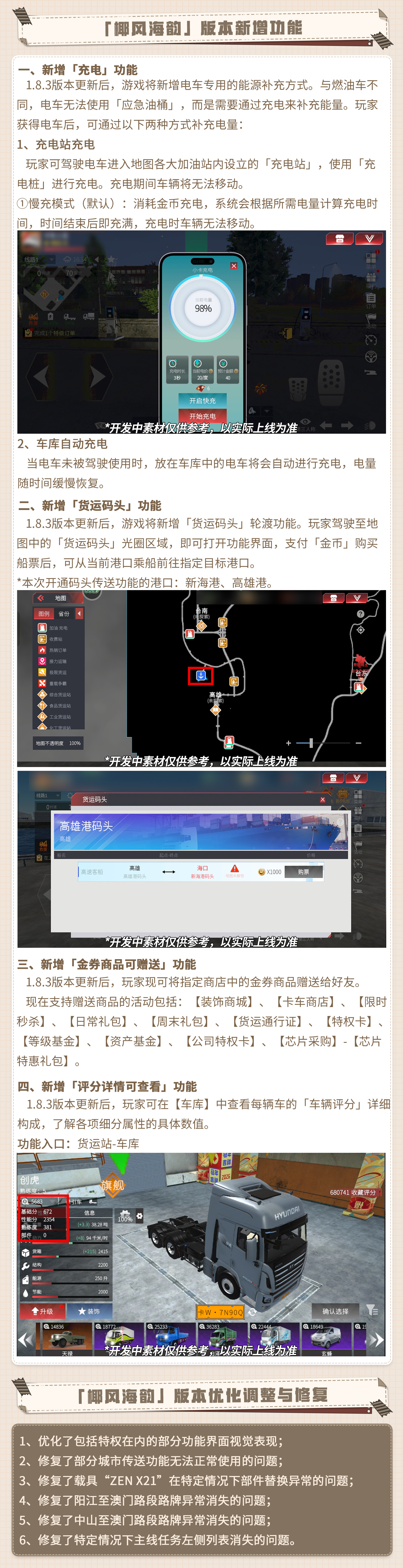 1.8.3「椰风海韵」版本将于2026年1月26日正式更新,在近期的“科普加油站”栏目中,我们已为大家预告了有关新版本车辆、地图等相关内容,也引发了不少卡友的关注与讨论,而大家十分关注的码头跨海运输细节、电车充电系统详情以及此前已在体验服率先亮相过的 「卡车竞速」等等全新内容,也将在本期策划直击得到进一步介绍说明。
