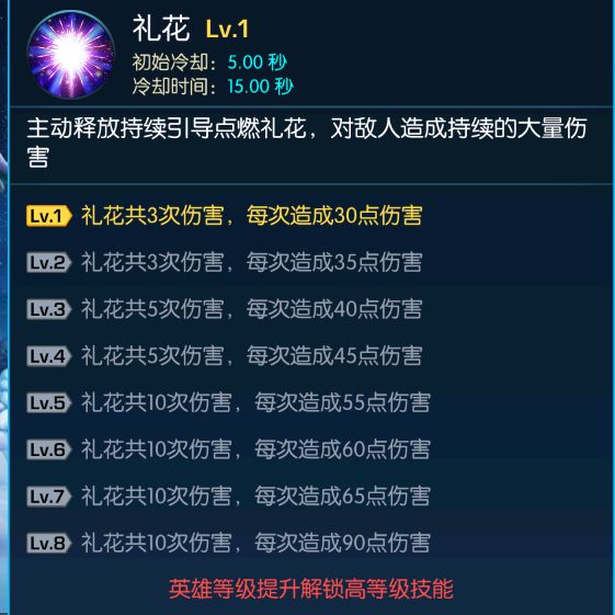 技能2礼花:需要持续引导释放(移动会打断技能噢)