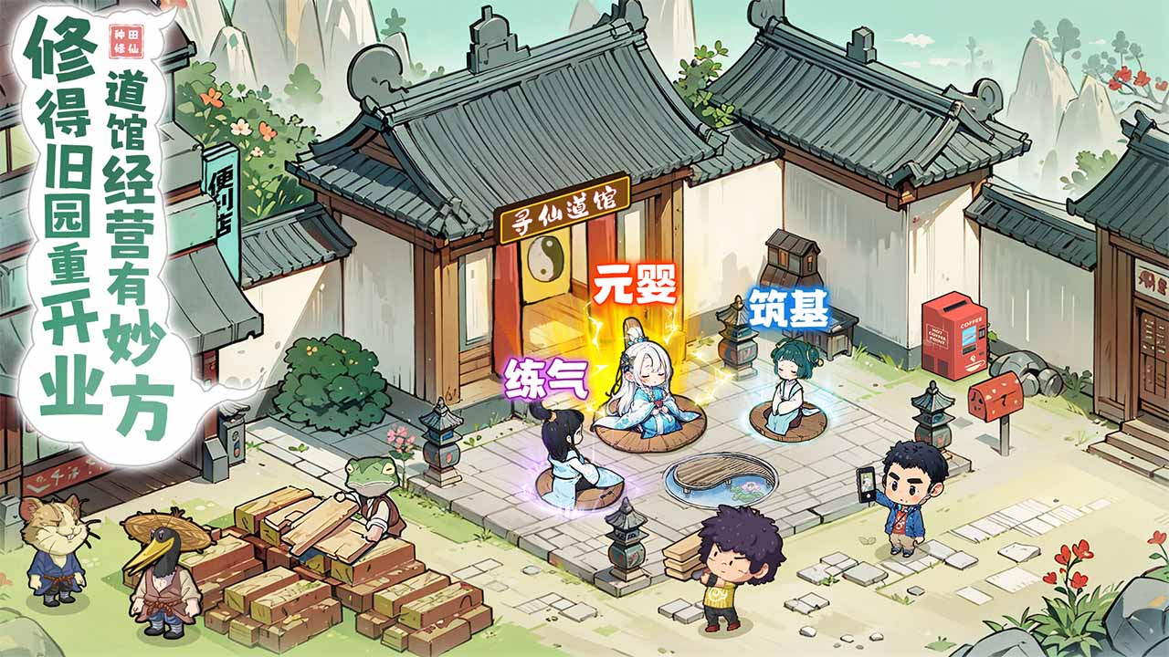 《种田掌门人》是一款非传统现代修仙+模拟经营手游,玩家将扮演一座破旧道馆的馆主,带领各类转世的神仙、妖怪或历史人物,通过经营道馆、积累功德,逐步重铸金身雕像、恢复修为,最终带领宗门重现往日辉煌。