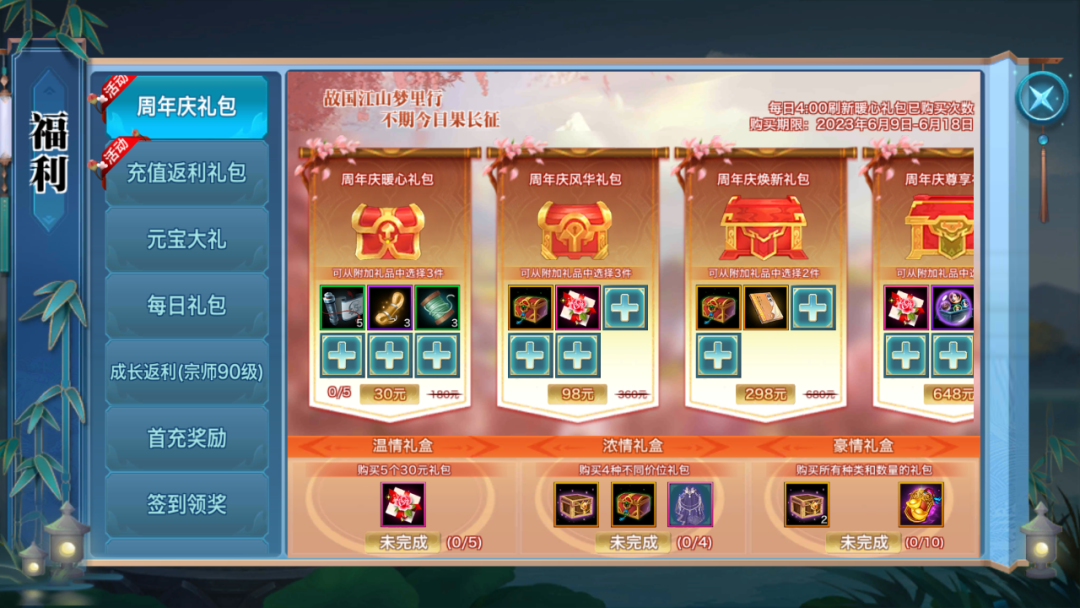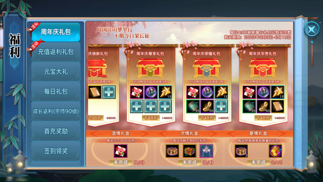 >>少侠购买完5个周年庆温情礼盒,可额外获得至尊7日礼包邀请帖。
