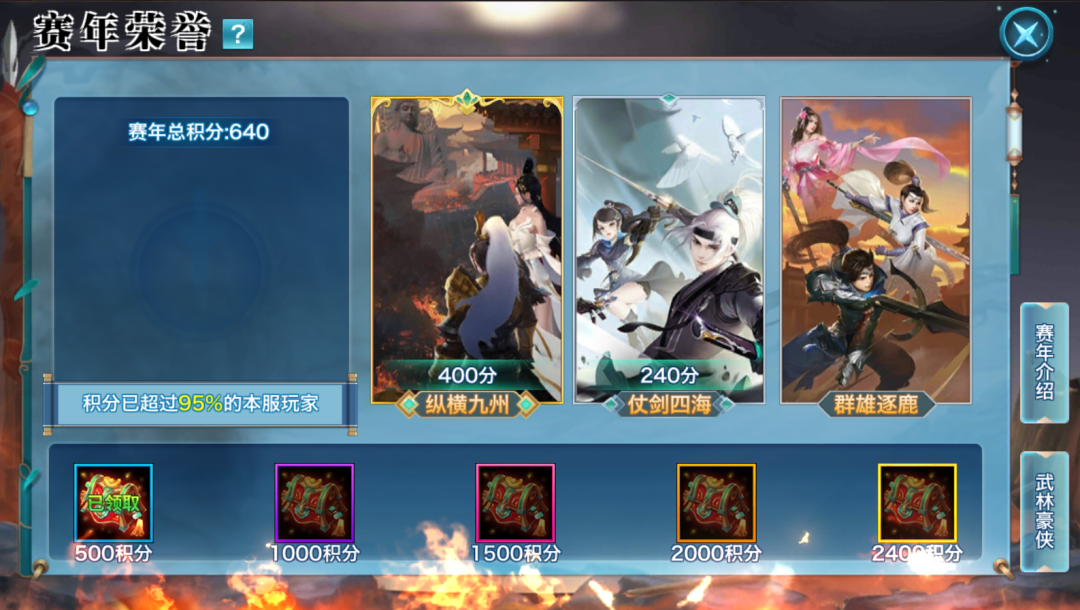 赛年荣誉,专属记录!当本届武林大会决出各赛制冠军后,系统会根据少侠的参赛成绩进行赛事评级,并给予对应的赛年积分计入【赛年荣誉】!