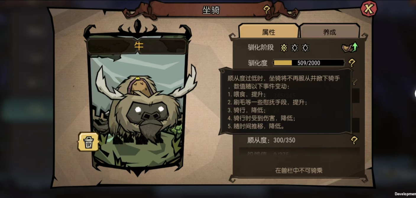 【坐骑驯化度】坐骑还有一项十分关键的属性——驯化度。冒险家们可要注意啦!人要工作得吃饭,坐骑要工作得吃好。长期不喂养,不刷毛、在某一天骑乘坐骑过程中,坐骑容易直接掀翻鞍具,人也会摔个底朝天。所以,关爱坐骑,从今日做起。