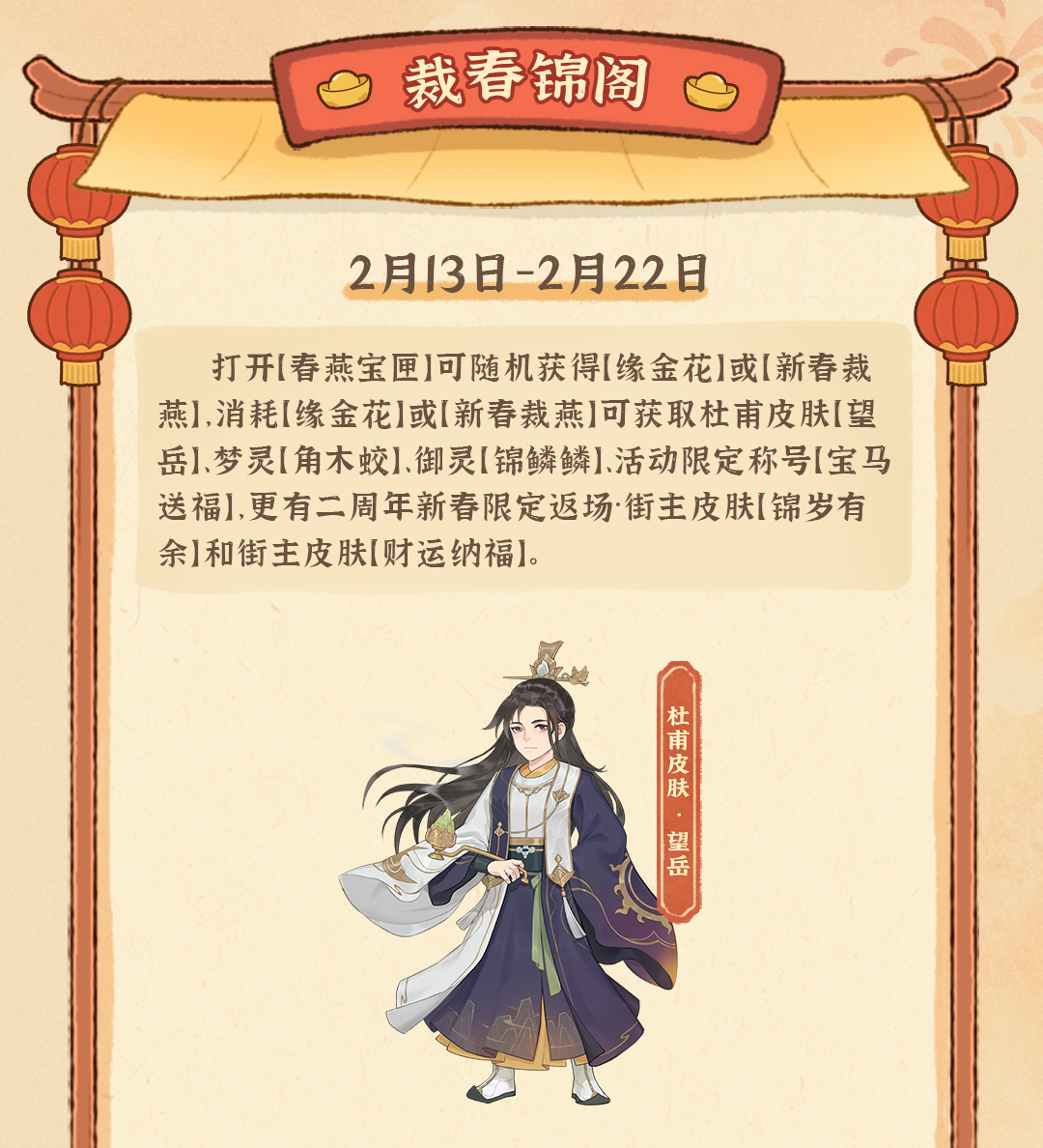 杜甫皮肤【望岳】、梦灵【角木蛟】、御灵【锦鳞鳞】、活动限定称号【宝马送福】!完成活动系列任务,最高可免费领130抽【琳琅梦柬】!参与赠花活动,赠送积分达到进度可免费领取