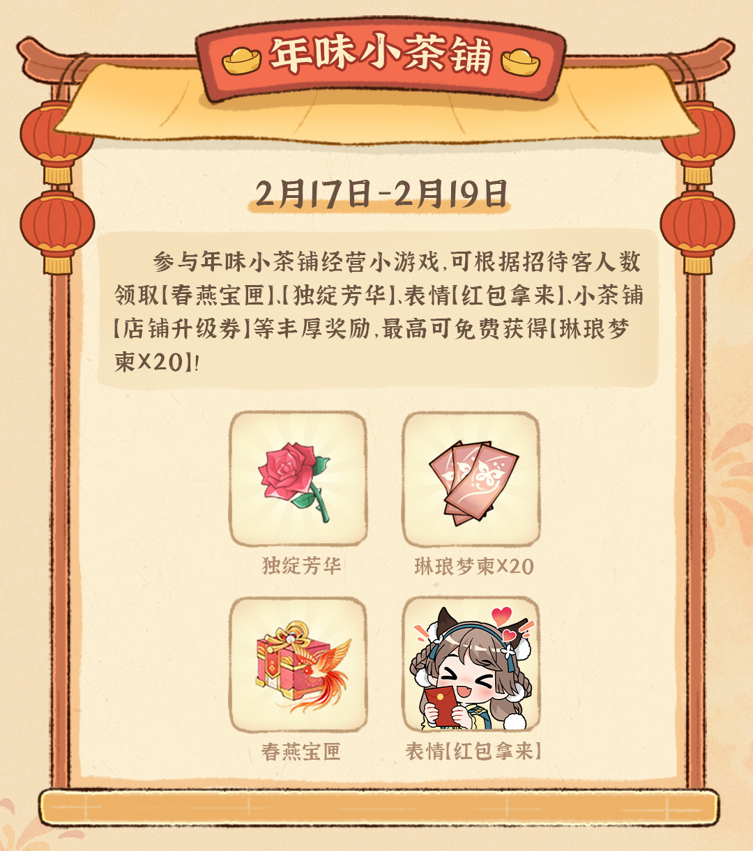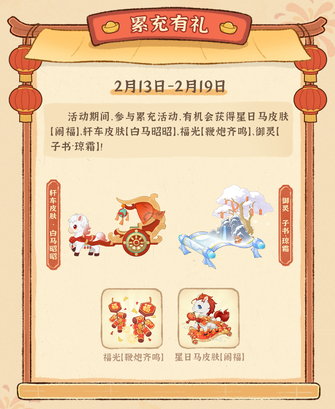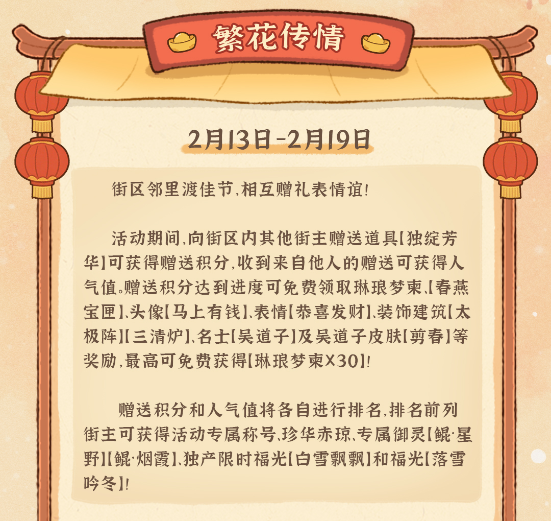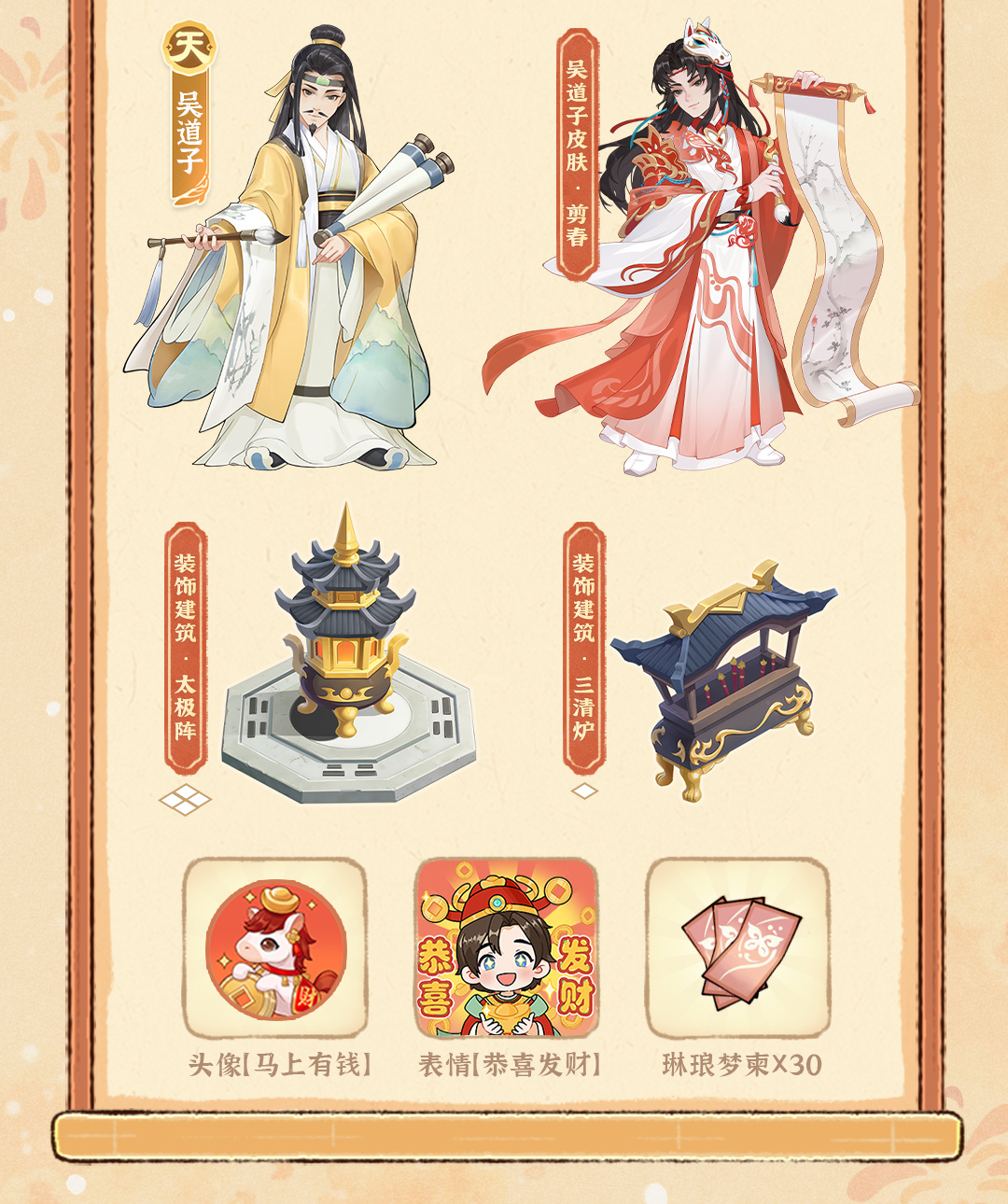 头像【马上有钱】、表情【恭喜发财】、装饰建筑【太极阵】【三清炉】、名士【吴道子】及吴道子皮肤【剪春】等奖励!