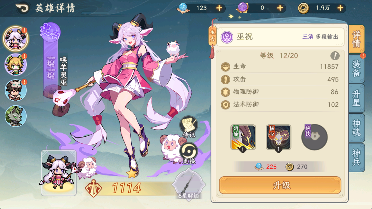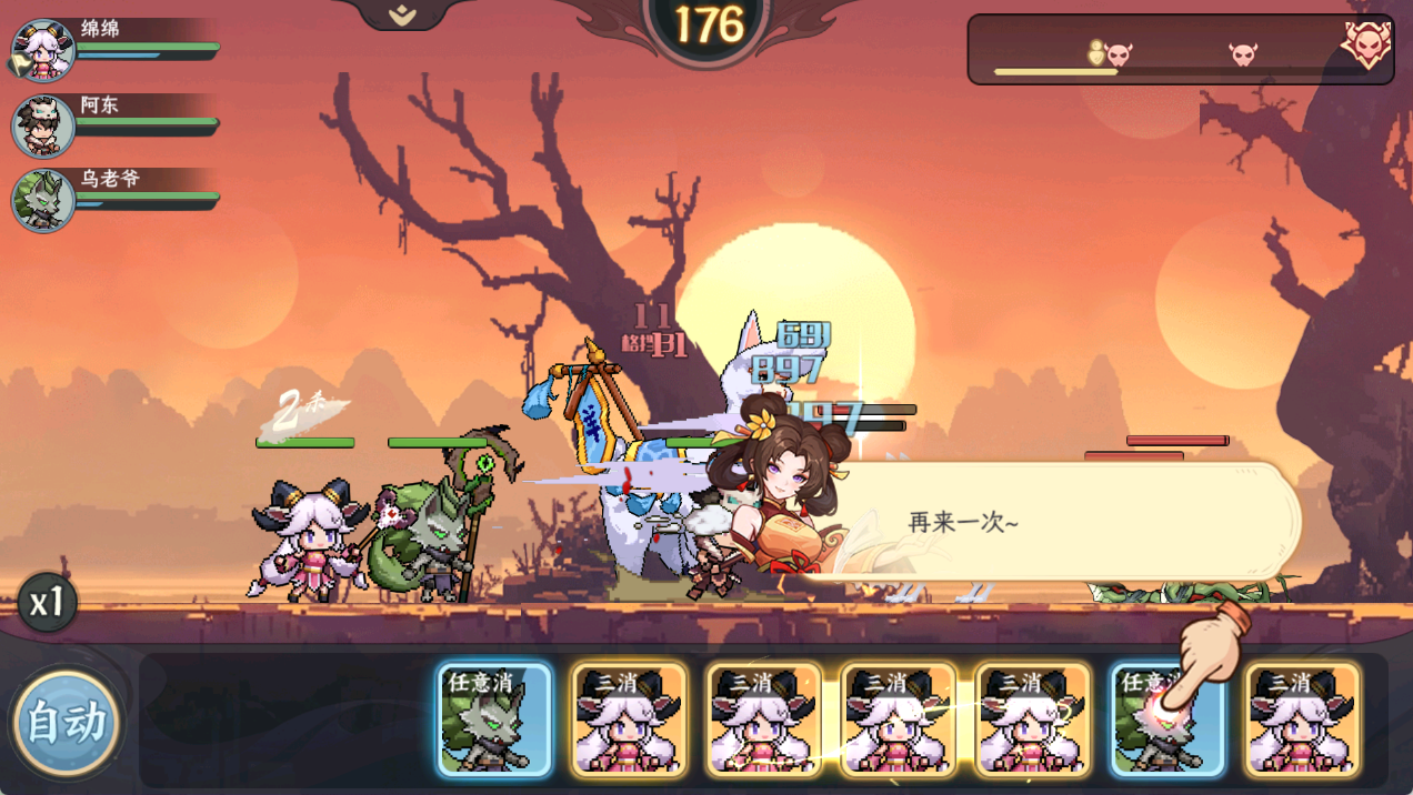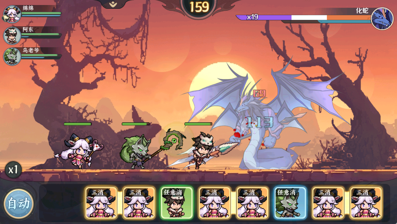 《山海幻境》的最大突破在于玩法融合。游戏摒弃了传统卡牌对战或回合制模式,转而采用“三消操作+即时战斗+RPG养成”的复合体系。三消能量机制:战斗界面下方为消除方块区,玩家通过滑动消除同色方块积攒能量,特定组合(如四连消、十字消)可触发角色大招。例如,消除红色方块可为物理输出型角色“后羿”积累“落日箭”能量,消除蓝色方块则能为法术型角色“妲己”蓄力“魅力狐火”。即时战斗策略:能量积攒后,玩家需手动释放技能,并通过走位躲避敌方攻击。BOSS战中,窫窳的“灯笼弱点机制”要求玩家优先攻击其头部灯笼以降低防御;而大羿的“箭雨”技能则需利用地形掩体规避伤害。RPG养成深度:角色拥有独立的成长路径,包括技能升级、卡牌进化、装备锻造等。例如,SSR角色“羲和”可通过收集“日炎碎片”解锁“烈日神威”的灼烧效果,装备“破晓元戎弩”后还能提升暴击率。这种设计既满足了休闲玩家对“轻操作”的需求,又通过策略性技能释放和阵容搭配,为硬核玩家提供了深度。