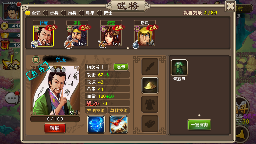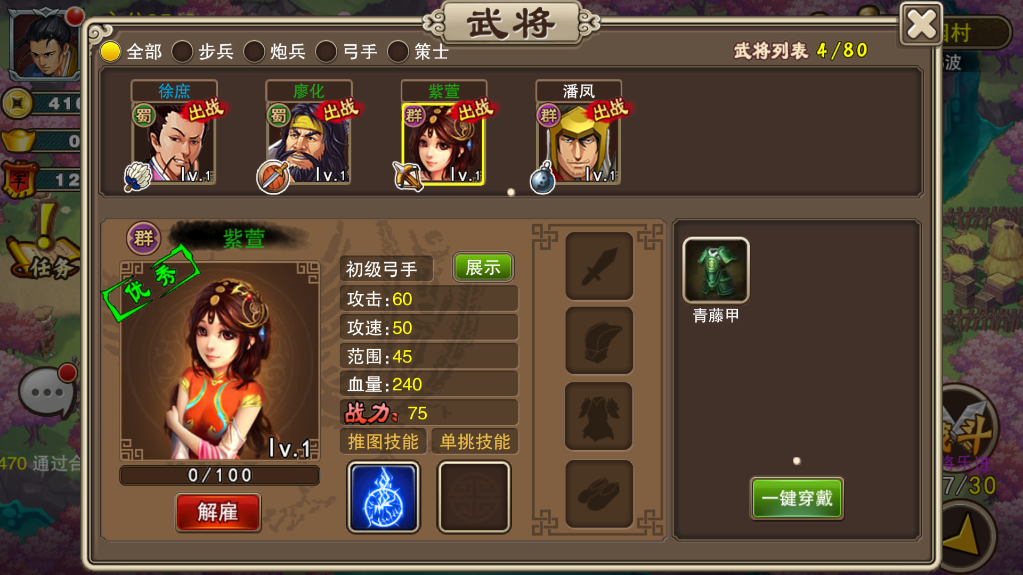 游戏目前收录200余名三国武将,按职业分为弓手、炮手、策士、步兵四大类,每类又细分普通、精英、神将三档品质。神将的设计尤为出彩,关羽:主动技能“武圣降临”可对直线范围内敌人造成300%伤害,并附带“破甲”效果,推图时一骑当千;诸葛亮:被动技能“借风引雷”每次攻击有概率触发连锁闪电,竞技场中堪称“人形自走炮”;袁绍:自爆步兵技能“血祭”可在死亡时对周围敌人造成真实伤害,魔王副本中常用于换命战术。角色获取采用“招募令+活动”双轨制:普通招募令可产出紫将,顶级招募令有概率获得神将。此外,游戏设计了“玄学招募”机制,部分玩家发现,在特定时间(如整点)、特定位置(如3号招募位)使用中级招募令,出神将的概率显著提升。