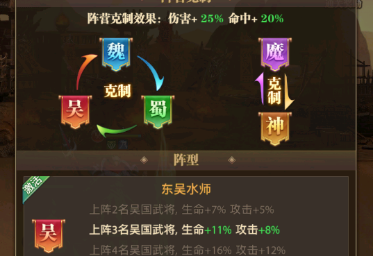阵营克制关系呈现环形链条:魏克吴(步兵克制弓兵)、吴克蜀(水战克制陆战)、蜀克魏(骑兵克制步兵),而神魔阵营相互独立,但会被特定阵营技能克制(如神阵营受魏国“强攻”影响降低治疗效果)。这种设计使零氪玩家通过阵营搭配(如吴国灼烧流)可逆袭神魔氪金阵容,验证了“策略大于数值”的核心理念。兵种相克系统引入步兵、骑兵、弓兵的三角关系,实战中需结合地形与阵营特性调整站位。例如在“合肥之战”副本中,魏国重步兵置于前排可降低骑兵冲锋伤害30%,后排吴国弓兵利用地形高差增加射程,同时蜀国谋士在侧翼释放“八卦阵”削弱敌方士气。这种多维战术配合,使战斗结果充满不确定性。