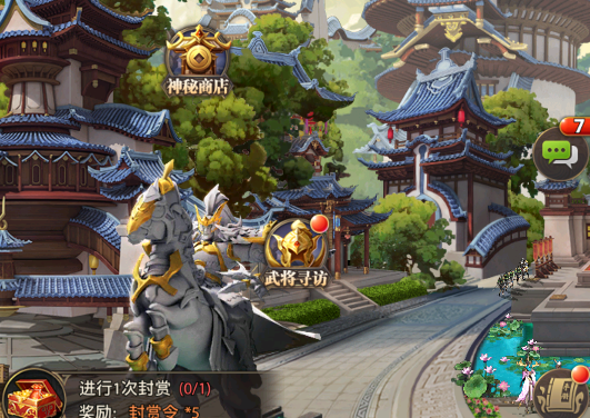 游戏主界面采用3D动态城池设计,以“桃源城”为原型构建的中央主城,通过昼夜交替系统与细节动画呈现生机。清晨时分,NPC士兵列队巡逻,商贩吆喝声此起彼伏;入夜后,灯笼摇曳的光影与远处传来的打更声,共同营造出真实的三国生活场景。这种动态环境设计远超同类产品的静态背景,使玩家每次登录都能感受到世界的变化。