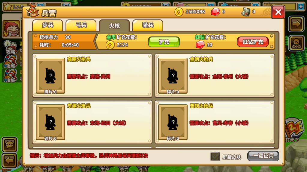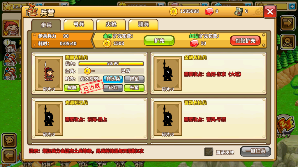 战争模块是游戏的进阶玩法,玩家需招募名将、训练兵种、组建军团,通过“战役-远征-军团战”三种模式扩张领土。游戏共有步兵、弓兵、骑兵、象兵、投石车五大基础兵种,以及高丽弓箭手、罗马军团、蒙古骑射等特色兵种,不同兵种存在克制关系:步兵克制弓兵(可近身攻击)、弓兵克制骑兵(远程射击)、骑兵克制步兵(冲锋伤害加成),这种设计要求玩家在战斗前根据敌方兵种配置调整阵型。