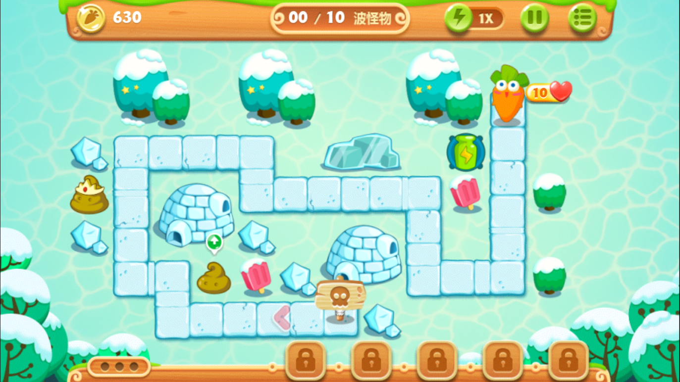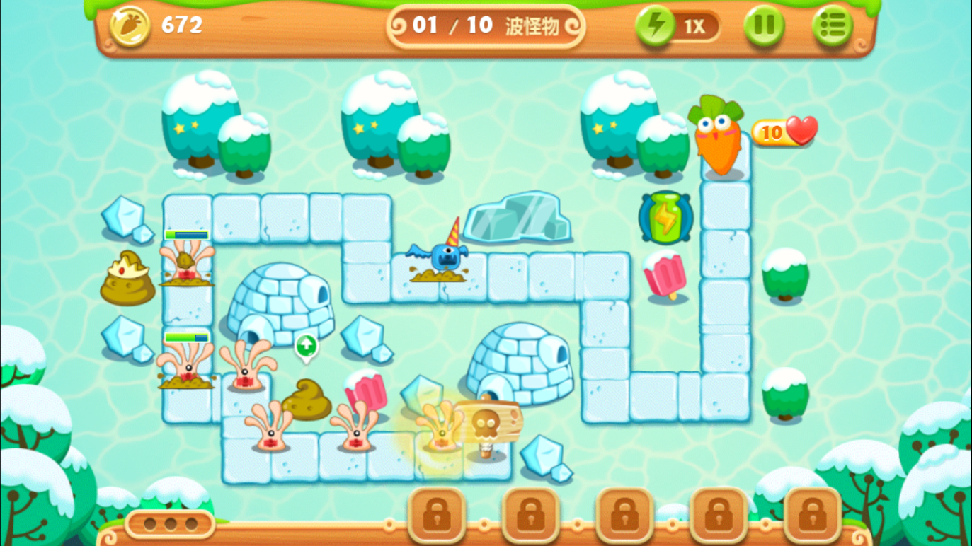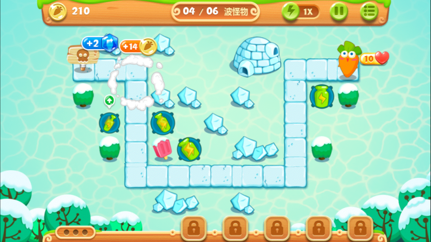 《保卫萝卜2》的剧情世界观设定简单而有趣,为游戏增添了一份别样的魅力。游戏以一只可爱呆萌的萝卜为主角,讲述了它乘坐着小船打算开始一次说走就走的旅行,却不幸遭遇冰山撞击,套着救生圈漂到了一片冰天雪地的世界中,而在这个极地世界里,又有一大群准备吃掉它的可怕怪物等待着它。为了保护自己,萝卜不得不拿起武器,建造防御塔,与怪物们展开一场激烈的战斗。这种简单而又富有童趣的剧情设定,不仅容易让玩家产生共鸣,迅速融入到游戏的世界中,还为游戏增添了一份轻松愉快的氛围。玩家在游戏中不再是单纯地进行塔防战斗,而是仿佛化身为主角萝卜,亲身经历这场惊险刺激的冒险之旅,这种代入感使得游戏更加具有吸引力。