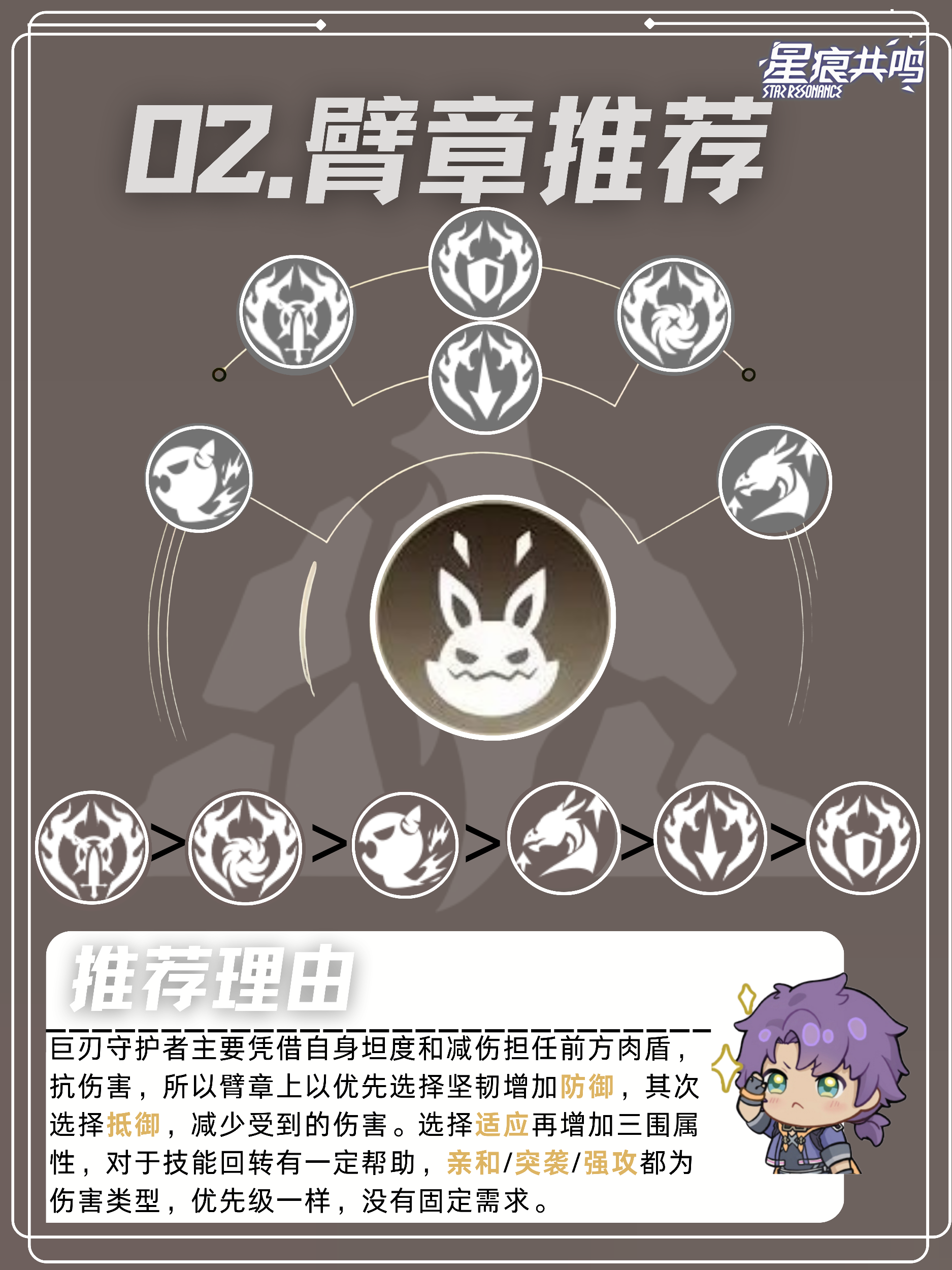 巨刃守护者主要凭借自身坦度和减伤担任前方肉盾,抗伤害,所以臂章上以优先选择坚韧增加防御,其次选择抵御,减少受到的伤害。