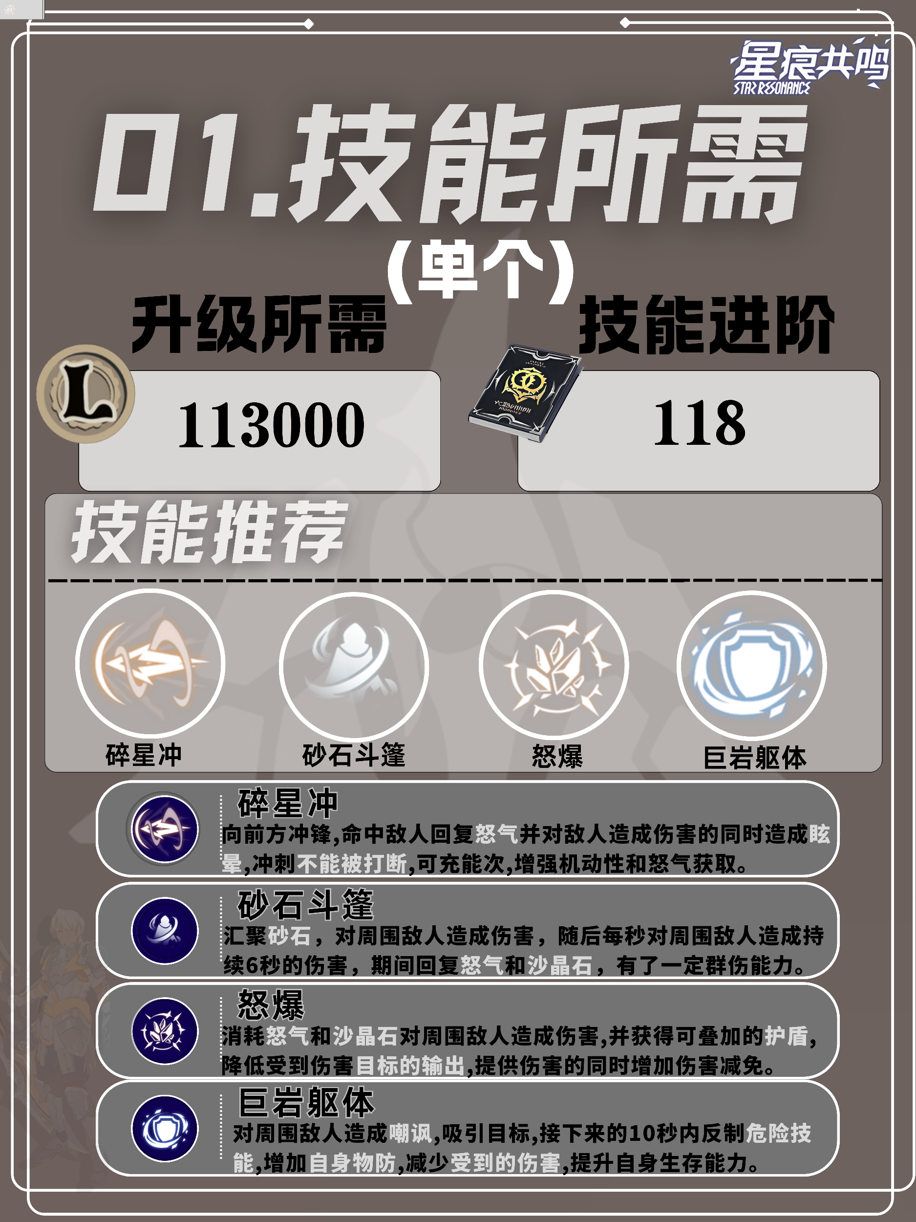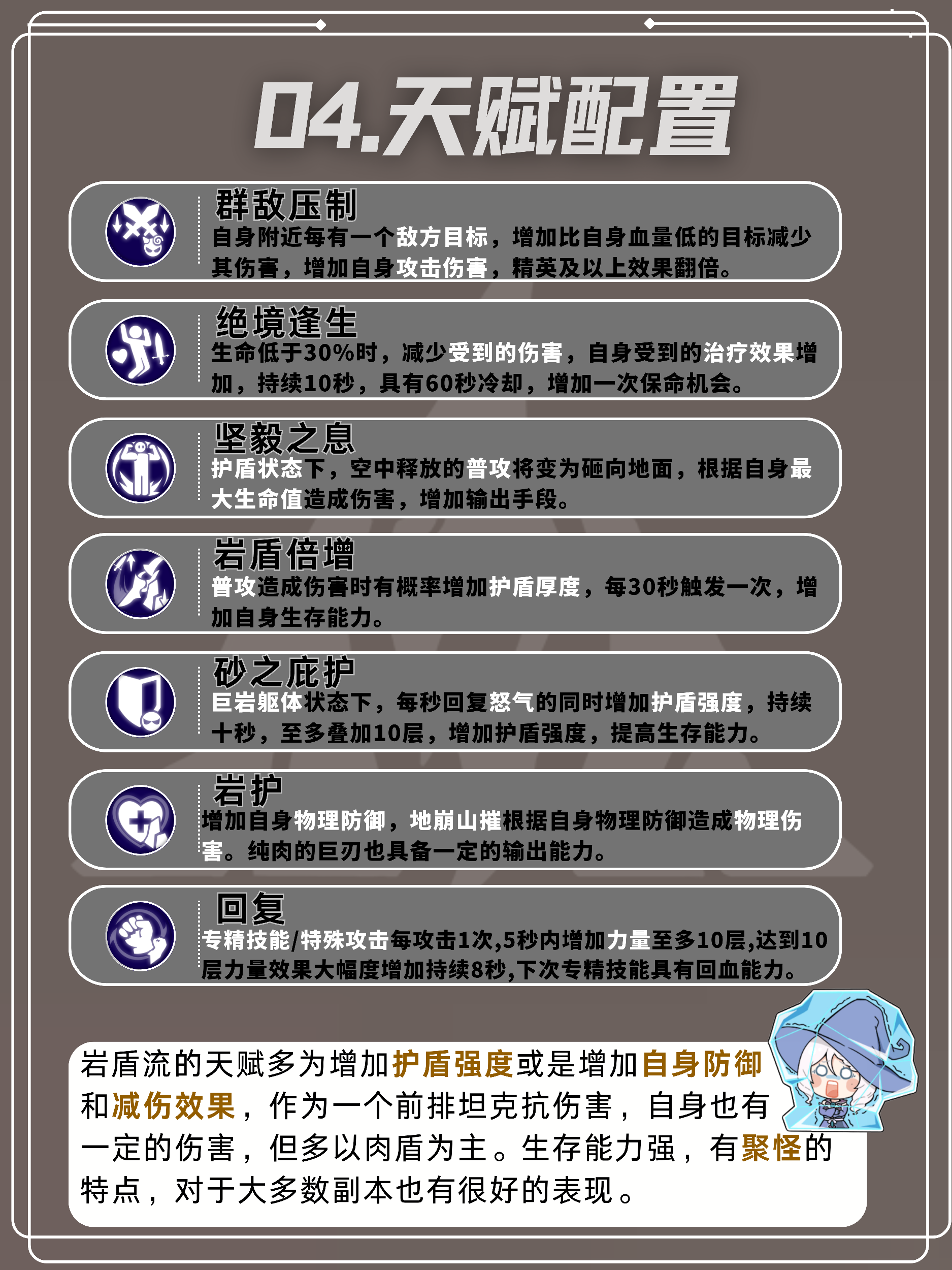 最后的技能可以选择「巨岩躯体」,巨岩躯体具有嘲讽效果增加物防和减伤的效果,可以大大提高生存能力。