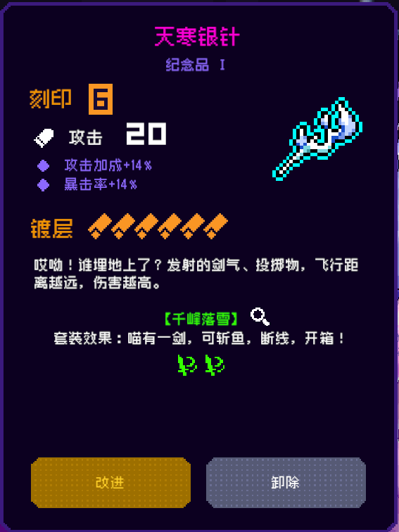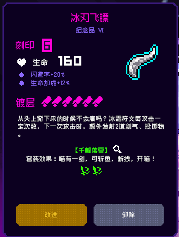 收集10个“冰属性纹章”后可激活机制——近战武器每攻击命中10次,获得1个冰霜符文。近战武器发射剑气或投掷物攻击时,冰霜符文将复制一道相同的攻击。”