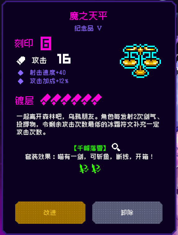 角色每发射2次剑气、投掷物,令剩余攻击次数最低的冰霜符文补充一定攻击次数,十分有效的延长了冰霜符文的攻击次数。