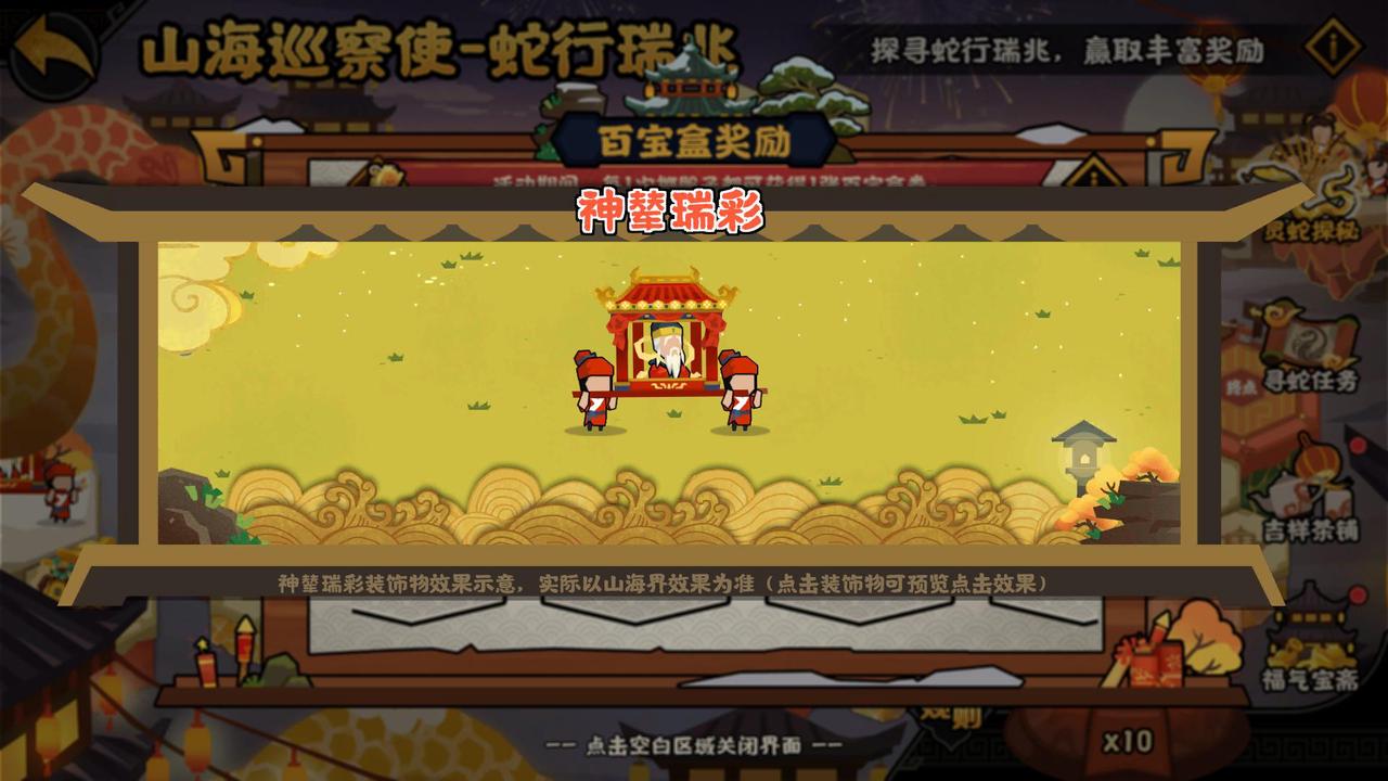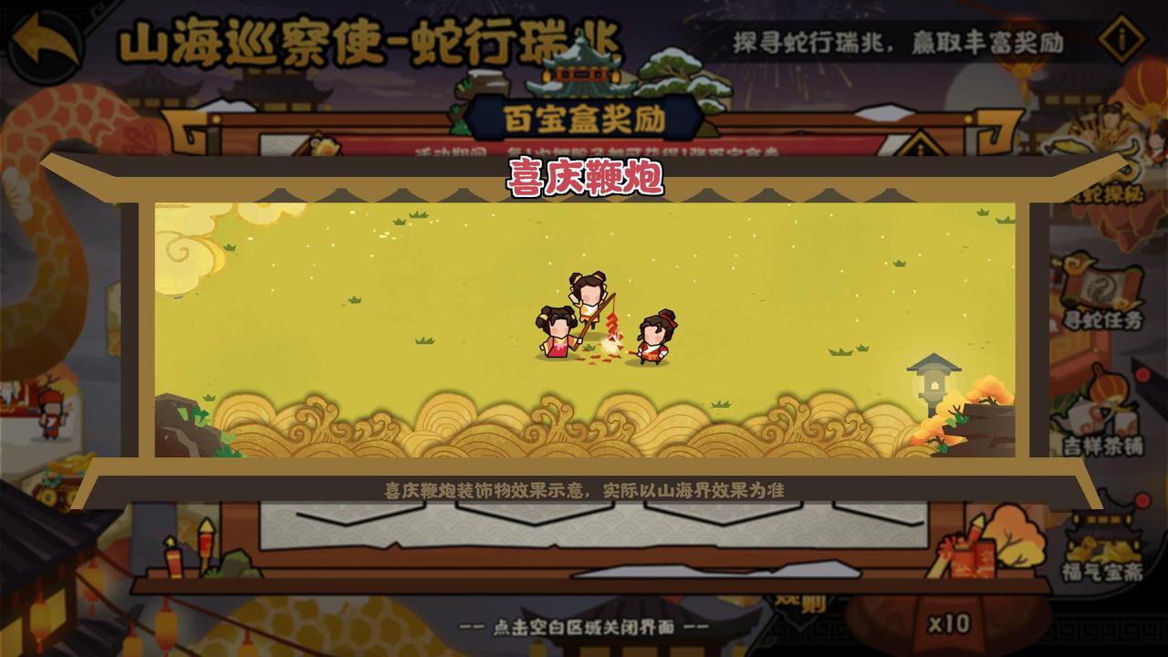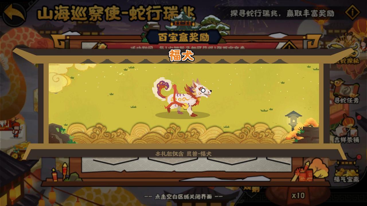 活动期间,探索蛇形瑞兆,即可获取丰富道具奖励!杨戬全新动态华服‘开山’、‘封神英杰’名臣自选宝箱、‘灵蛇之礼’华服自选箱、山海界全新摆件‘喜庆鞭炮’、‘神辇瑞彩’、‘聚宝盆’、全新灵兽‘福犬’、龙须笔......等你来拿!喜欢的王上不要错过哦!