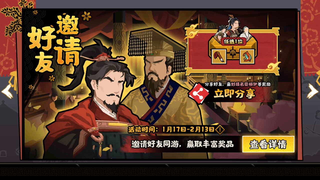 王上们期待的好友邀请活动也要上线啦!1月17日更新后至2月13日,邀请好友同游即可赢取丰富道具奖励,名臣自选礼盒、龙须笔、六色泥等你来拿!