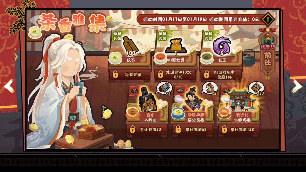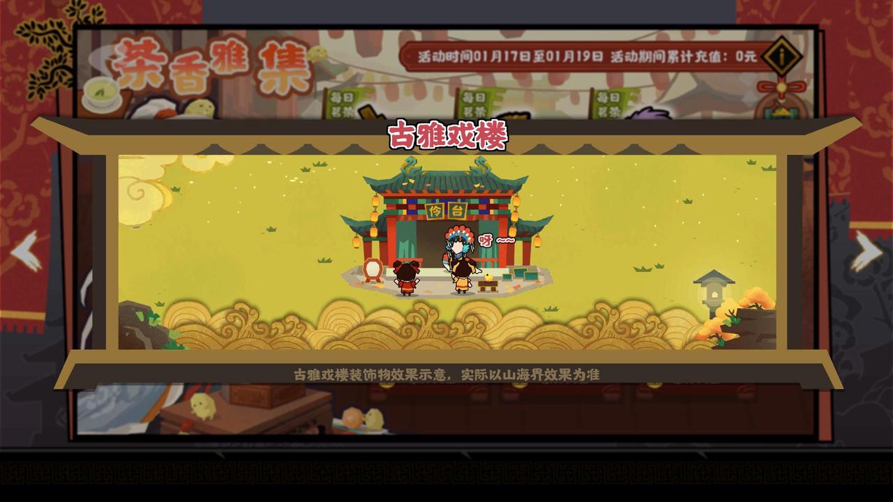 1月17日至1月19日,全新一期茶香雅集也要开放啦!活动期间完成对应任务即可获取丰富道具奖励。纹石、山海之鉴、玄玉等你来拿!除了每日都会刷新的“每日茗茶”之外,还有全新音乐‘入阵曲’、李牧全新静态华服‘居边良将’和山海界全新摆件‘古雅戏楼’~ ❛‿˂̵✧