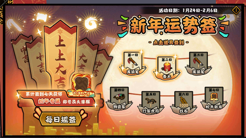 1月24日至2月6日,全新签到‘新春运势签’即将登场!蛇年专属限定头像框等你来领!还有龙须笔、香火、物资车...丰富道具签到获得~蛇年大吉,不要错过哦!