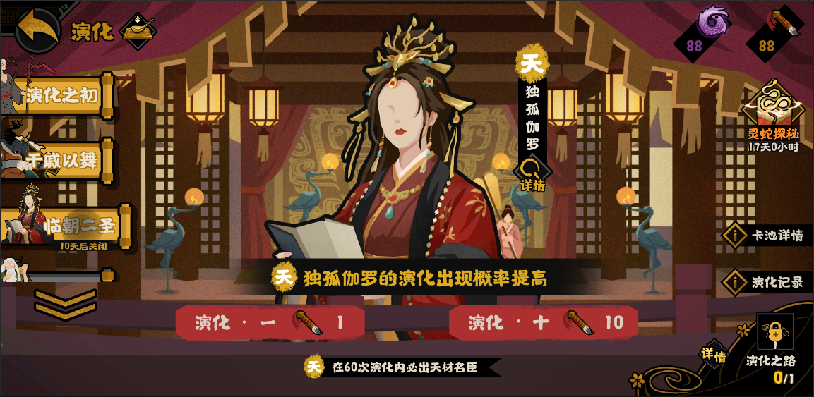 1月24日至2月9日,临朝二圣。全新天材名臣独孤伽罗演化概率限时上升!