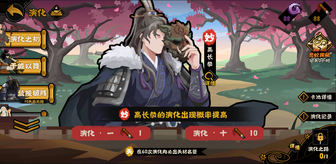 1月17日至1月30日,兰陵破阵。全新妙级名臣高长恭演化概率限时上升!