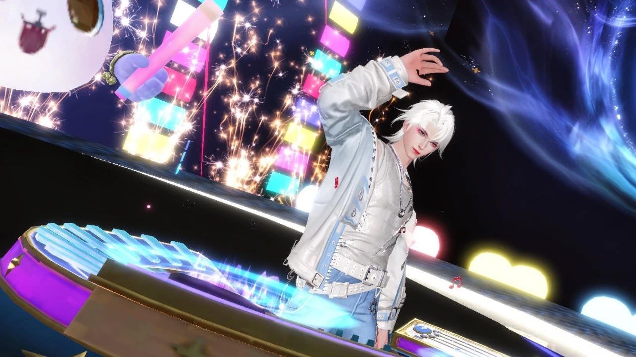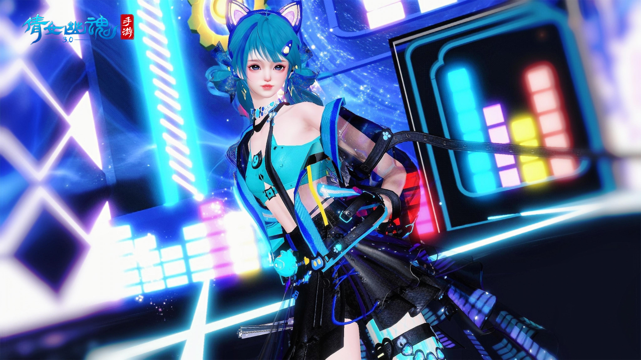 基本功打好了,当然得展示展示啦!夜场DJ @落笔写心动 正在热身,银白的背心搭配上蓝白渐变的夹克,立马就让心跳节拍·荧焰充满了未来感,再配合喵音·律动回响DJ台的律动节拍,瞬间将三界秒变为大型蹦迪现场!