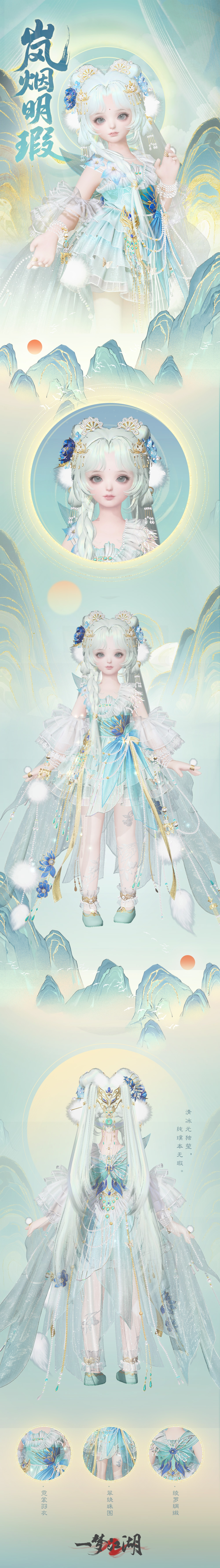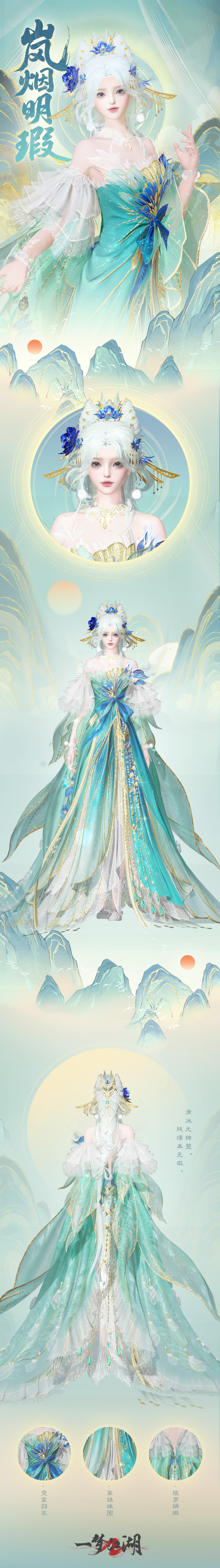 时装·岚烟明瑕取自大师傅在山间邂逅青狐而得的灵感,半透白纱层层叠叠,模拟狐绒;金线刺绣提升质感,衣摆的青山花纹和流水质感暗纹呼应青狐主题。局部白色绒毛点缀,尽显狐狸的灵动感;一抹抹的克莱因蓝点翠,彰显青山绿水的层次。