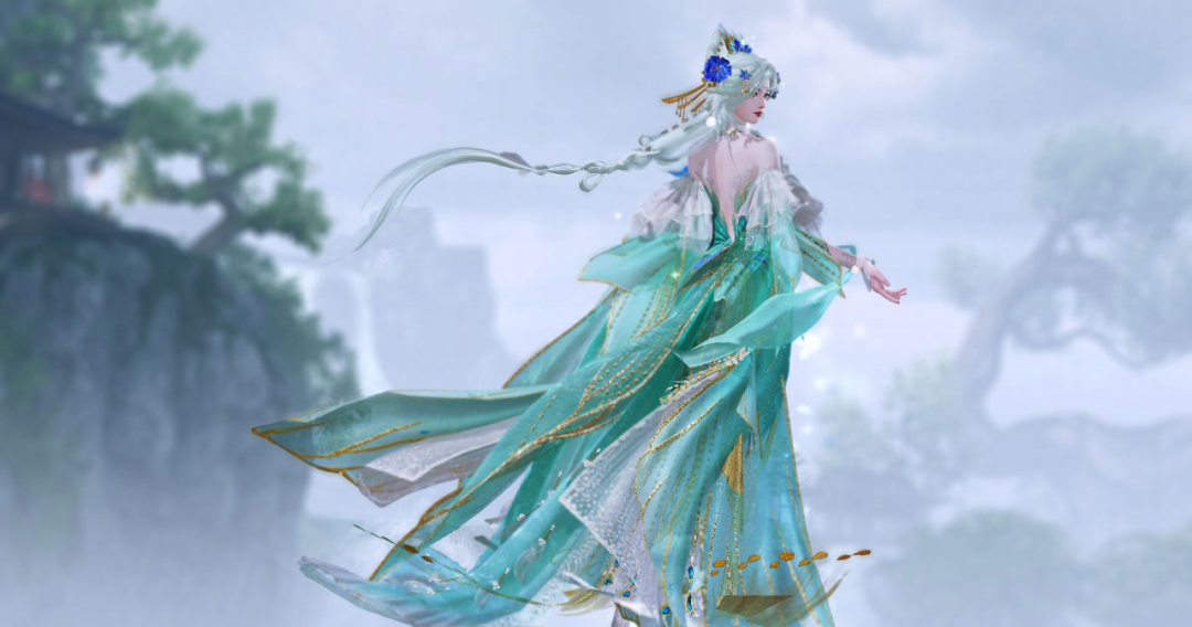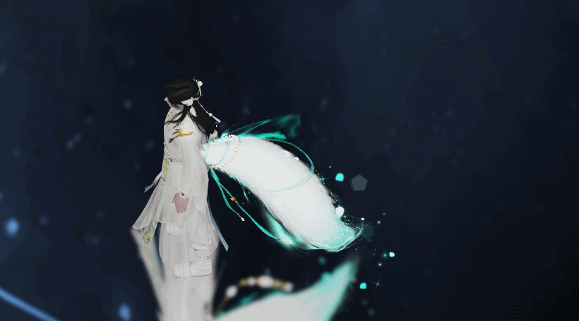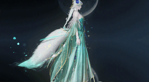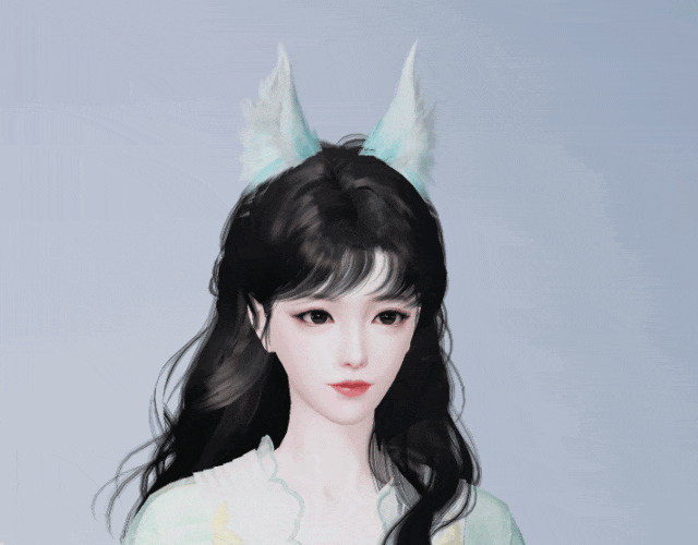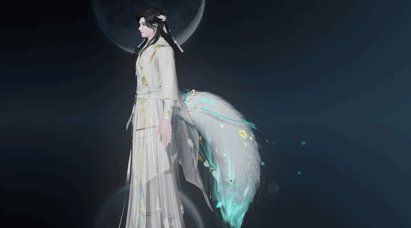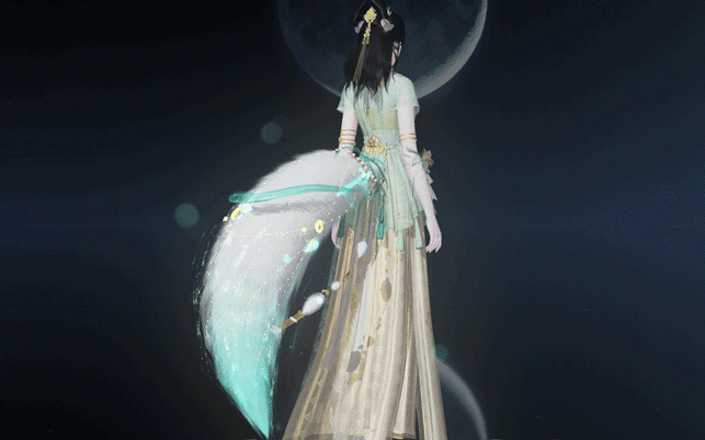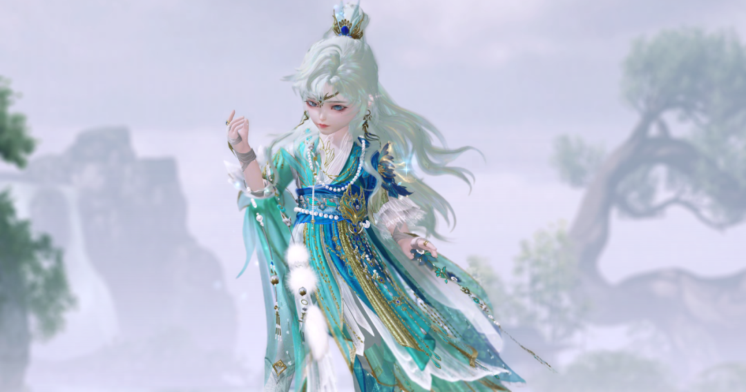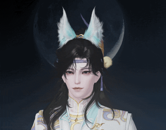 泛着淡青的发丝像冰绸又像水缎,流淌着绚丽灵动的泠光,随着移动还会折射出彩色的虹晕,与整体华丽而端庄的气韵恰然相应。青狐之雅、山水之幽、玉石之润,浑然一体,展现出仙域领主青狐清雅如岚的气质。