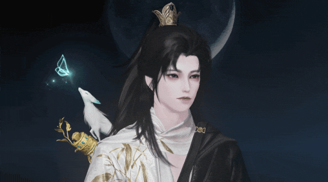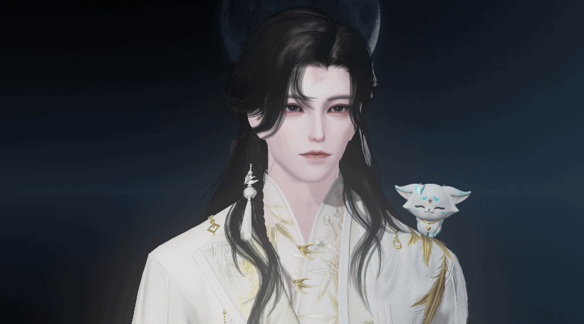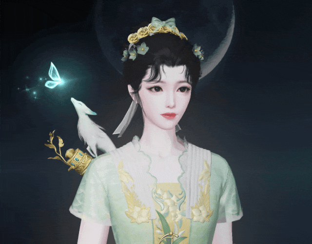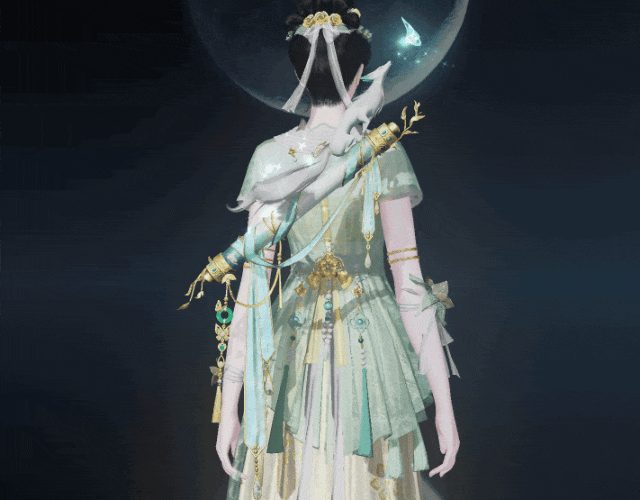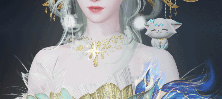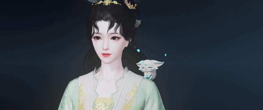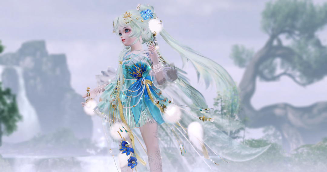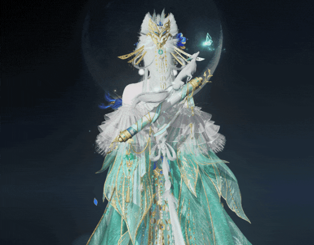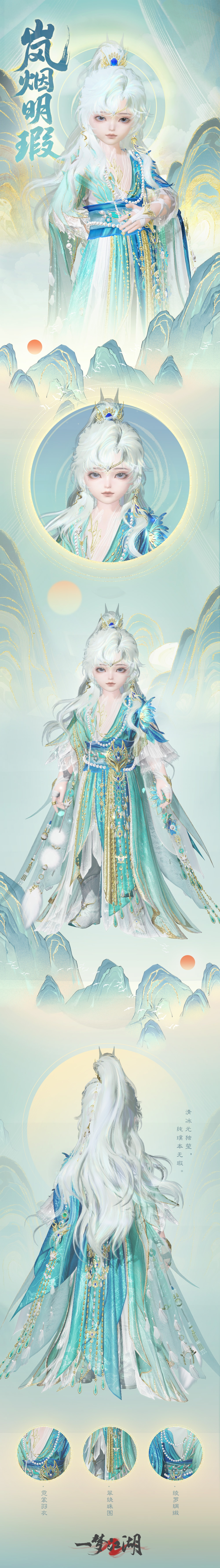 泛着淡青的发丝像冰绸又像水缎,流淌着绚丽灵动的泠光,随着移动还会折射出彩色的虹晕,与整体华丽而端庄的气韵恰然相应。青狐之雅、山水之幽、玉石之润,浑然一体,展现出仙域领主青狐清雅如岚的气质。