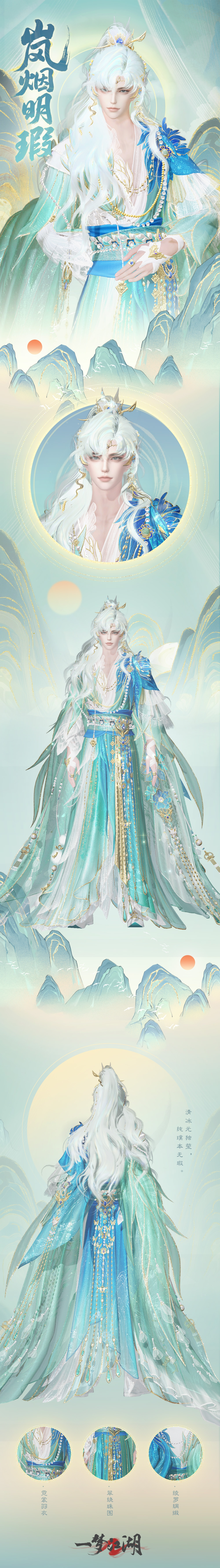 男款广袖间垂落的半透青白纱如狐尾扫过寒潭,在步履间掀起朦胧岚烟。金线绣制的重峦叠嶂随动作浮动,似藏着一卷未展的山水——那正是他掌管的千里仙境。腰间金饰流苏,肩膀克莱因蓝点翠,千里江山图般的配色,与玉珠璎珞等相映,恰是"千年修得玉为骨,九尾扫开云作裳",令人见之忘俗。
