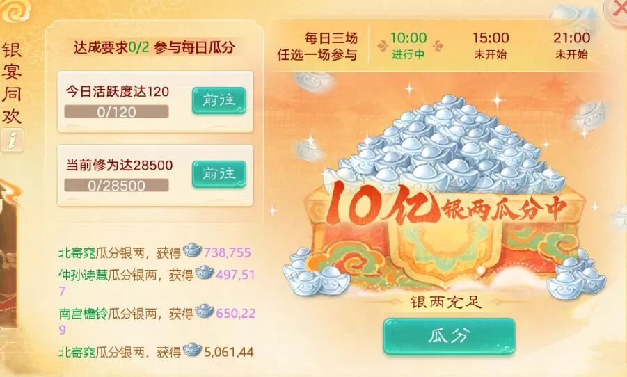 1)新服首日开放活动,活动持续15天。少侠只要达到瓜分标准,就可以在银库中瓜分一次银两;