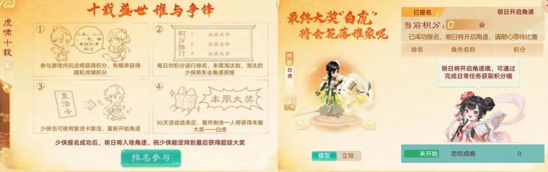 1)报名后次日开启角逐,参与游戏内玩法获得奖励的同时,有概率获得随机数量的虎啸积分;
