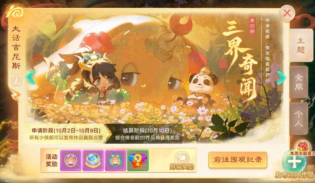 1)9月25日 10:00,大话吉尼斯新主题-天命佩饰申报纪录开启,9月26日10:00,大话吉尼斯新主题-三界奇闻申报纪录开启,三界奇闻可申报游戏精彩录屏视频;