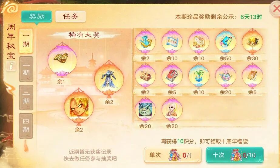 活动期间,少侠只需完成游戏内常规活动或任务,即可获得积分领取十周年福袋,使用十周年福袋开启赠礼即有机会获得赤焰妖、小颜如玉、1级五行材料等惊喜奖励!
