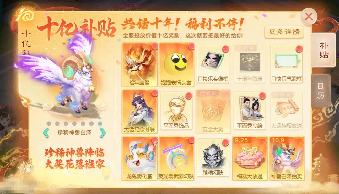 十年相伴,全服豪掷价值十亿福利,只为宠你!座驾、时装、红包、贵重道具奖不停!9月25日永久提升道具福糕大放送,10月9日珍稀神兽白泽抽奖!