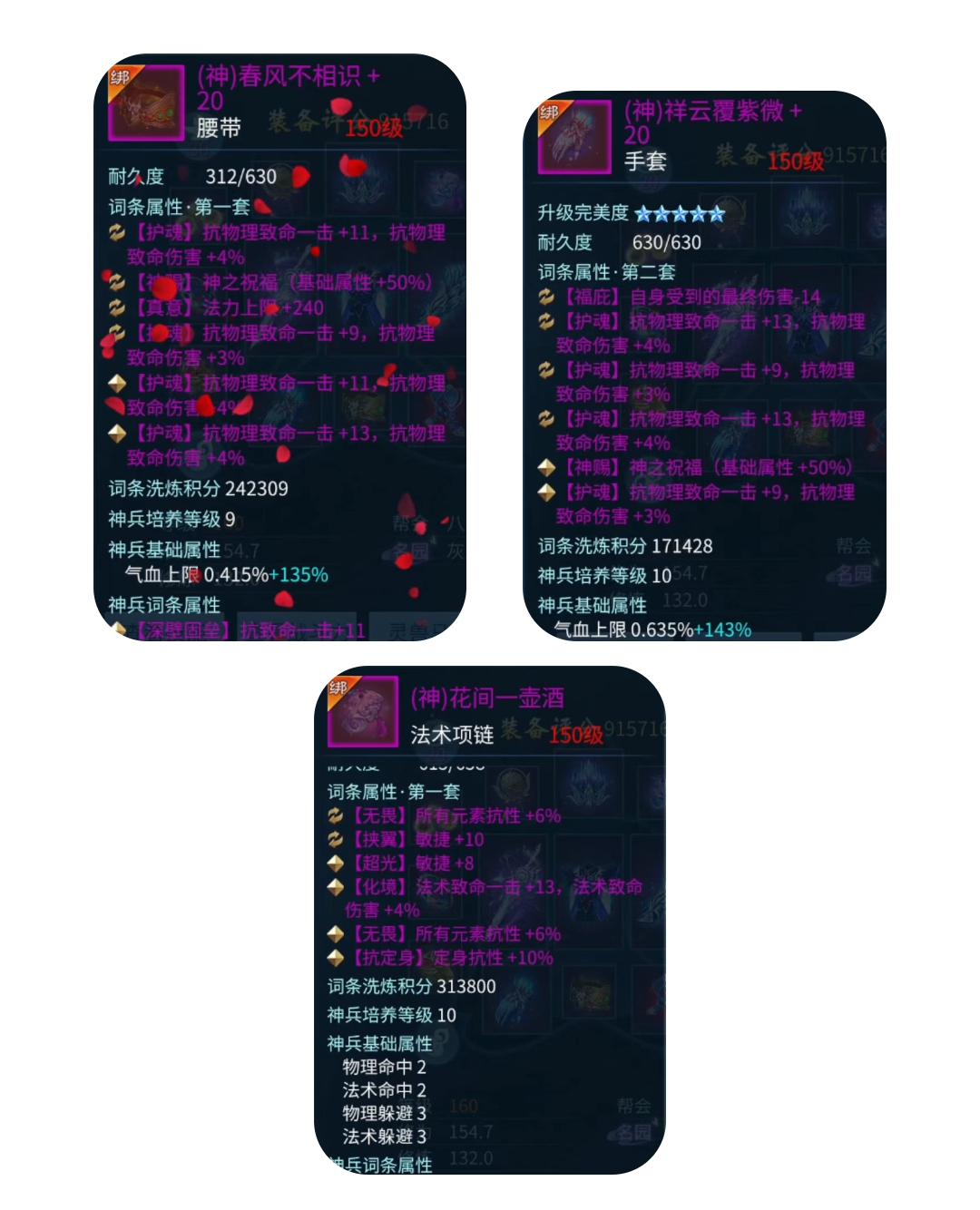 腰带和手套都做了气血、50加抗暴的属性,配合项链的元素加攻击加控制抗属性,使剑仙具备了生存能力,真正做到攻防兼备。