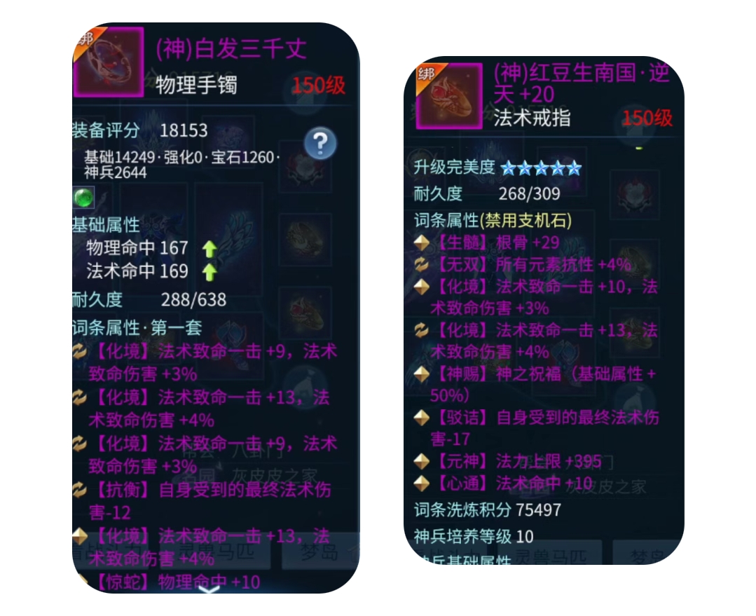 手镯和戒指都拥有非常高的致命词条,保证剑仙职业的法系输出能够让对手吃到位;戒指则在保留致命和攻击的前提下,洗出元素抗词条。