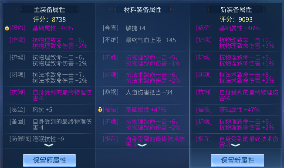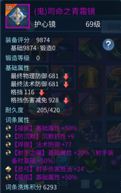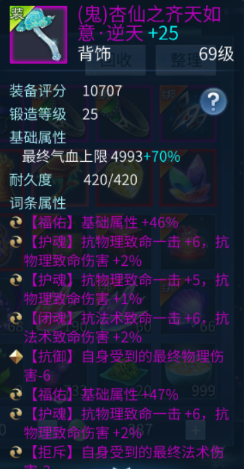 背饰因为可以进行熔炼合成,被不少小伙伴开发出了新玩法, 其中不乏6抗致命、6忽视等。本次投稿菌菌收到了一件较为特别的背饰,首先它是一件逆天属性的鬼背饰,拥有2条福佑词条,并且附带了3条抗物理致命与1条抗法术致命,制作难度实在不低。