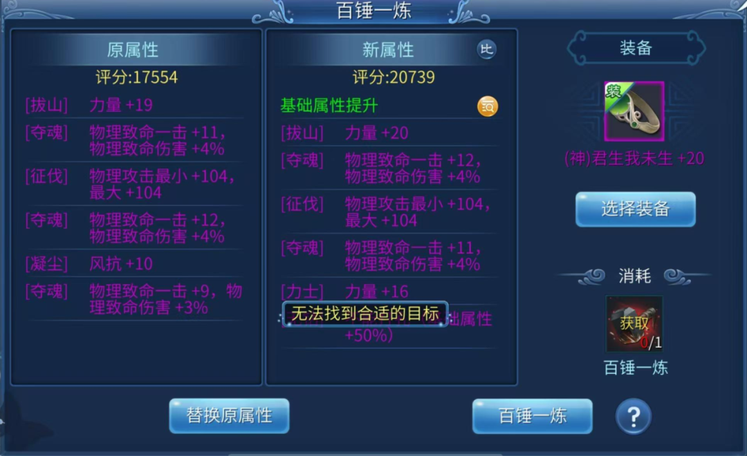 前段时间的天工铸器活动,产出不少“十锤一炼”、“百锤一炼”道具,让一些小伙伴都趁此机会洗出了自己心仪的装备,比如这位小伙伴,就为自己的戒指锤炼出了一条“无钻”词条,属实是“一发入魂”!