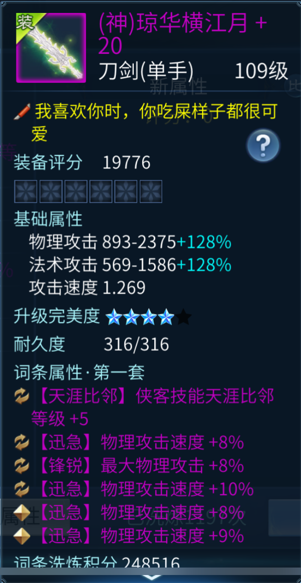 这把109级鬼刀剑,一定能满足不少侠客小伙伴对武器的想象。它不仅拥有侠客不可或缺的物理攻速词条,并且是4条总计35%的高数值加成,还携带了5级天涯比邻与最大物理攻击,妥妥的侠客“白月光”武器。