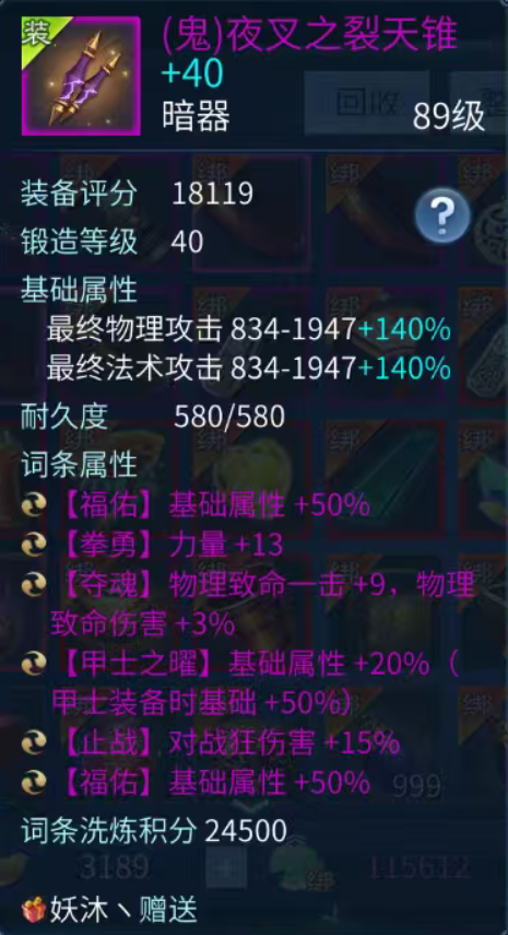 还有这件暗器,不仅有双福佑甲士之曜,号主还熔炼进了一条止战词条,针对战狂堪称趁手利器。